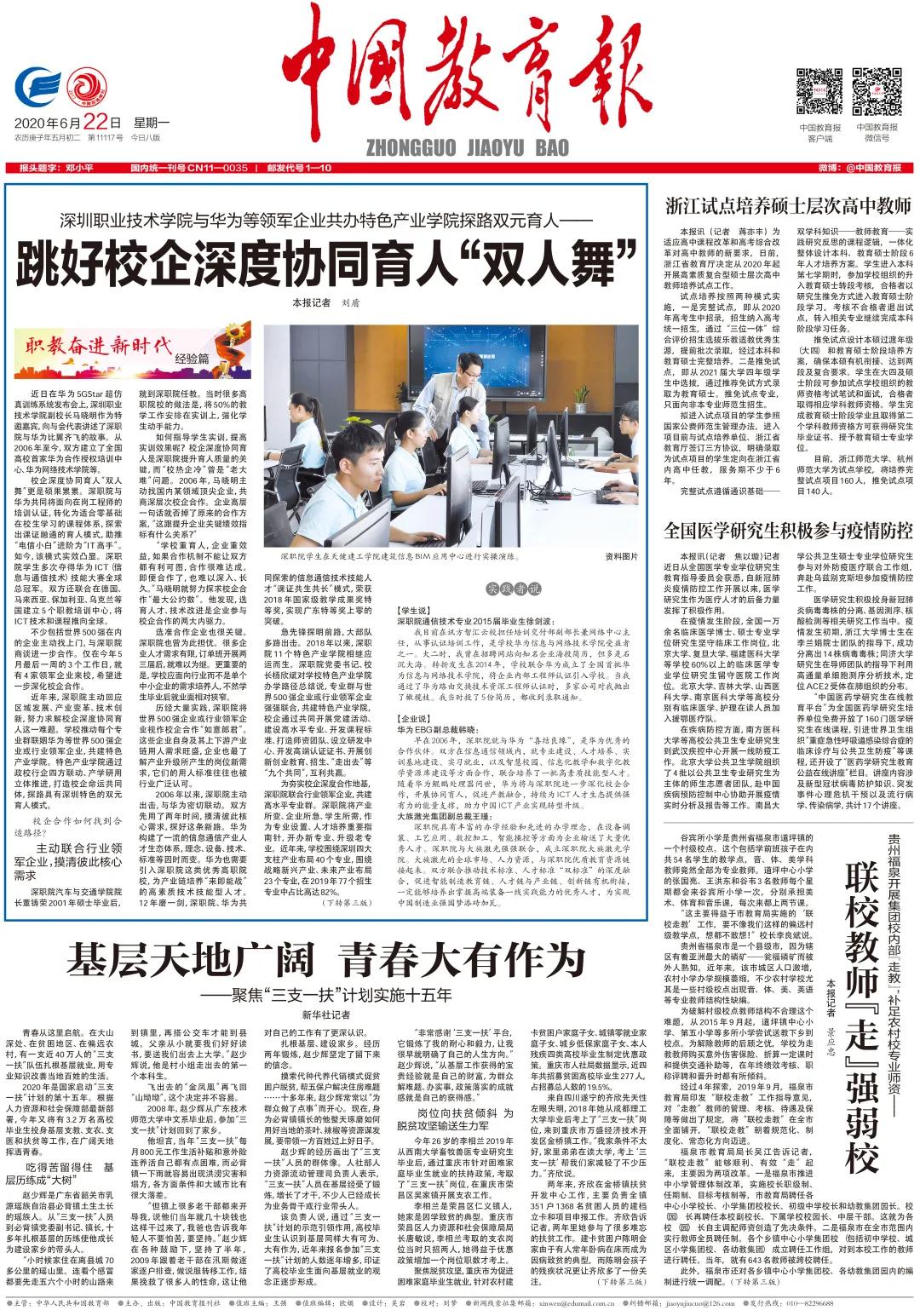 編者按:6月22日,《中國教育(yu)報》頭(tou)版頭(tou)條紅頭(tou)欄目(mu)“職教奮進新時代 經驗(yan)篇”以《深圳職業(ye)技術學院與華為(wei)等領軍(jun)企(qi)業(ye)共辦(ban)特色產業(ye)學院探路(lu)雙元育(yu)人——跳好校(xiao)企(qi)深度協同育(yu)人“雙人舞”》為(wei)題,對我校(xiao)校(xiao)企(qi)協同育(yu)人的創新理念和豐碩成果進行了深入報道(dao),引起廣泛的社會(hui)反響(xiang),現全文轉載如下,與廣大(da)師生(sheng)共勉。