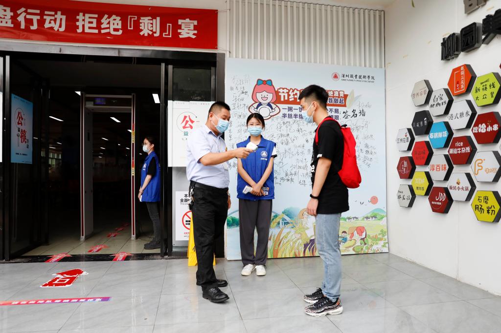 學生到達食堂門口,按一米以上間隔距離排隊有序進入食堂,穿過測溫門測量體溫。